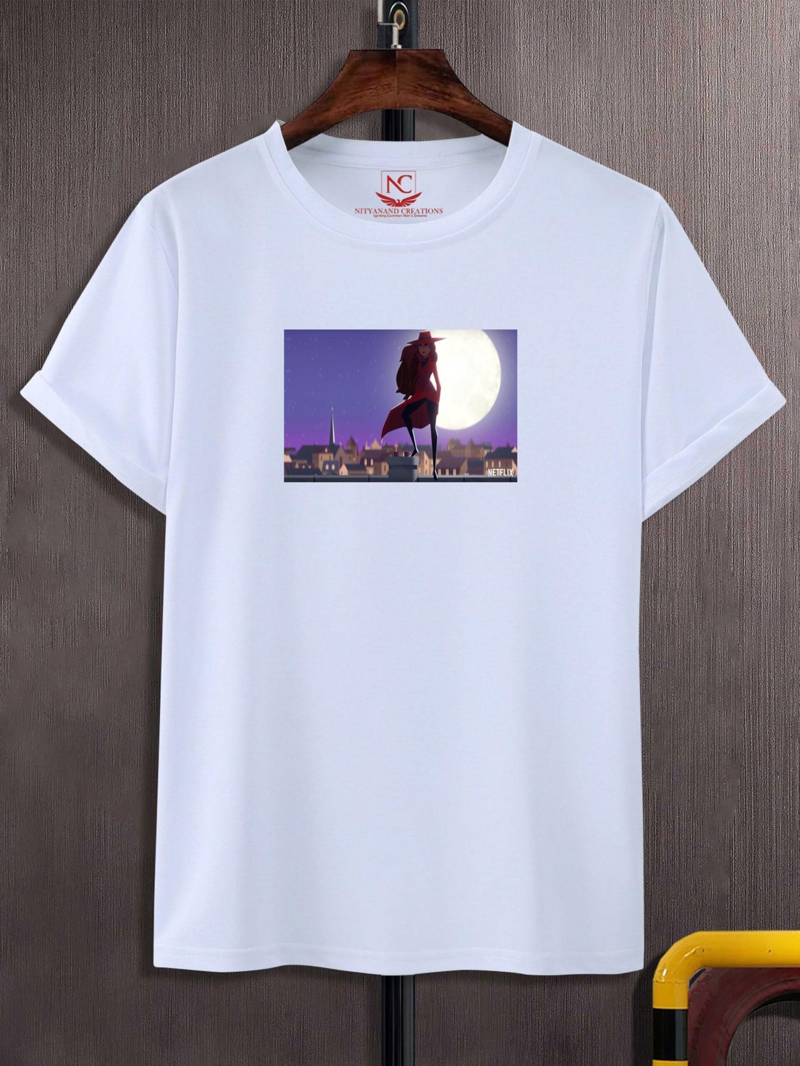 This graphic print is designed to stand out on the clean white background of the shirt. The contrast between the bold red coat and the crisp white fabric ensures the image is both eye-catching and timeless. Whether you’re a fan of Carmen’s crime-solving skills, her thrilling escapades, or her unique style, this t-shirt is a perfect way to pay homage to the world’s greatest and most elusive criminal mastermind.