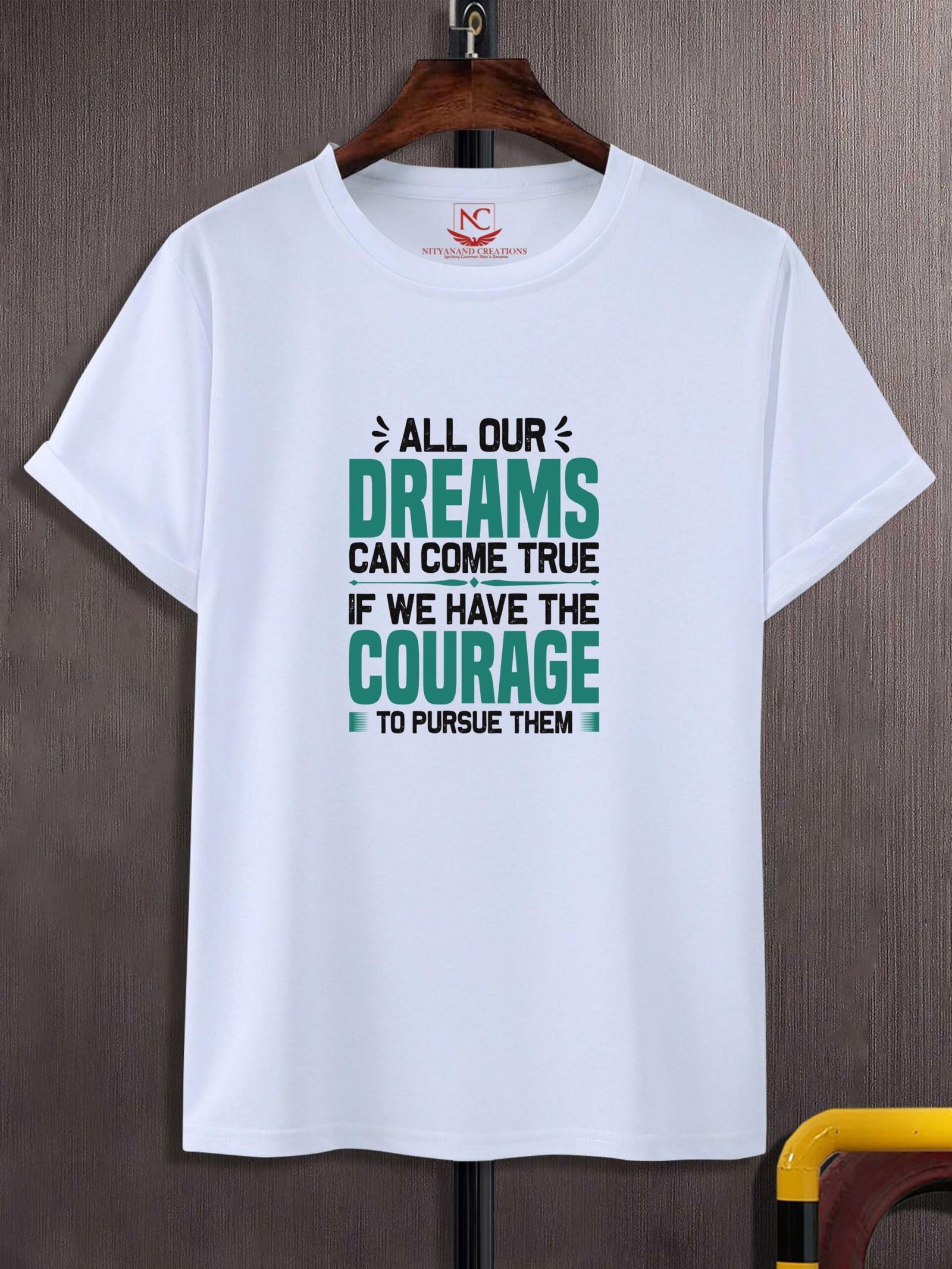 Embrace the power of inspiration with the Dreams & Courage Graphic Printed White Tee. This striking t-shirt is more than just a piece of clothing; it’s a bold statement about the importance of following your dreams and having the courage to pursue them. Crafted from high-quality polyester, this tee is designed for both comfort and style, making it an essential addition to any wardrobe for those who believe in the strength of their aspirations.