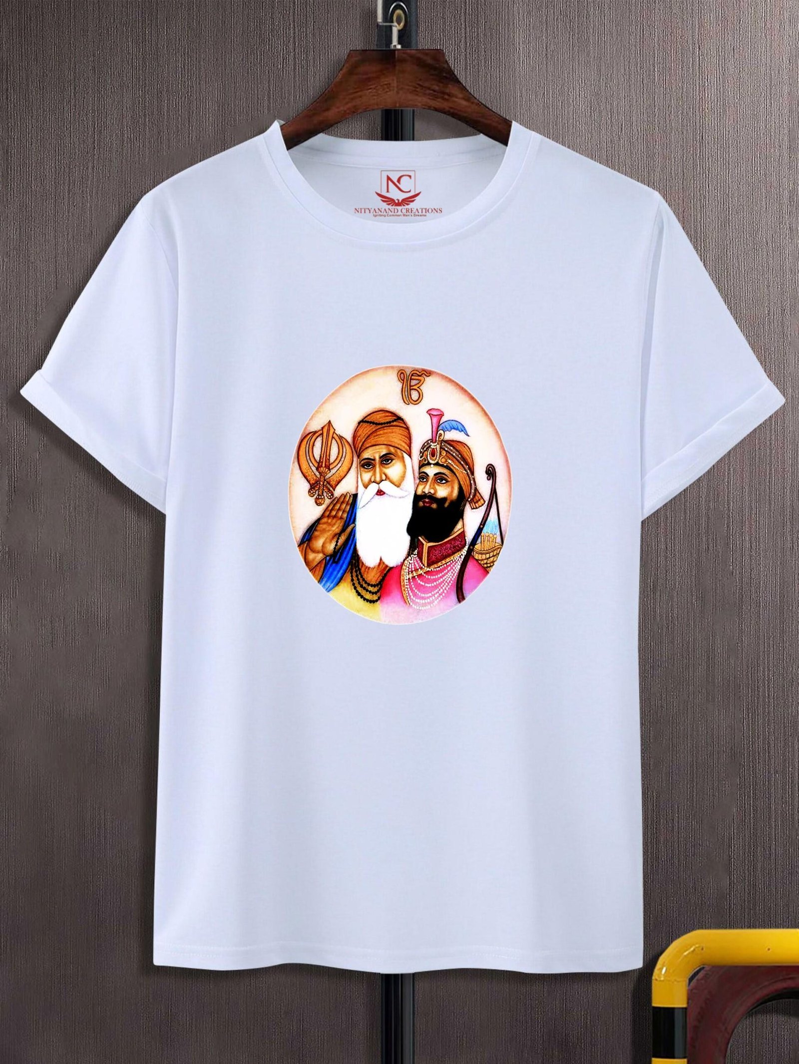 At the heart of this white T-shirt is a striking graphic of Guru Nanak Dev Ji, depicted with serene and dignified detail. The artwork embodies the wisdom and tranquility of the revered Guru, featuring intricate elements that reflect his spiritual legacy. The graphic is rendered in rich, vibrant colors that stand out beautifully against the crisp white fabric, creating a visually captivating representation of Guru Nanak’s divine presence. This design is not merely decorative but serves as a visual homage to his teachings of equality, compassion, and devotion.