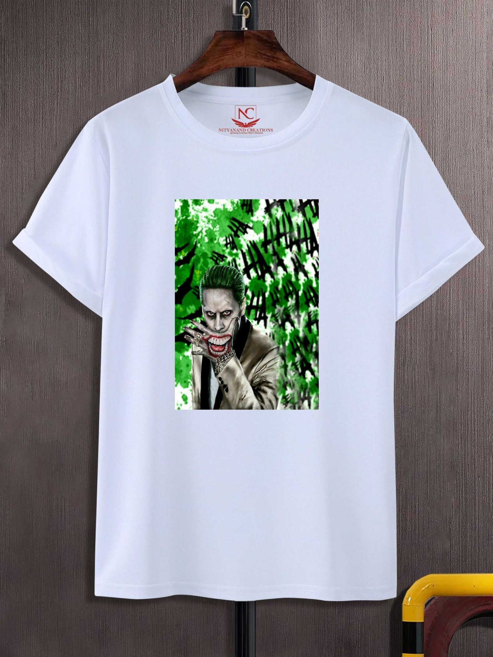 At the core of this t-shirt is a bold graphic print of the Joker, captured in all his flamboyant glory. The design showcases the Joker’s signature look—his menacing grin, wild hair, and iconic makeup—rendered with vivid colors and intricate details. The graphic embodies the Joker’s playful madness and enigmatic charisma, making it a standout feature of the t-shirt. The white background provides a clean canvas that highlights the vibrant artwork, ensuring the Joker’s larger-than-life personality takes center stage.