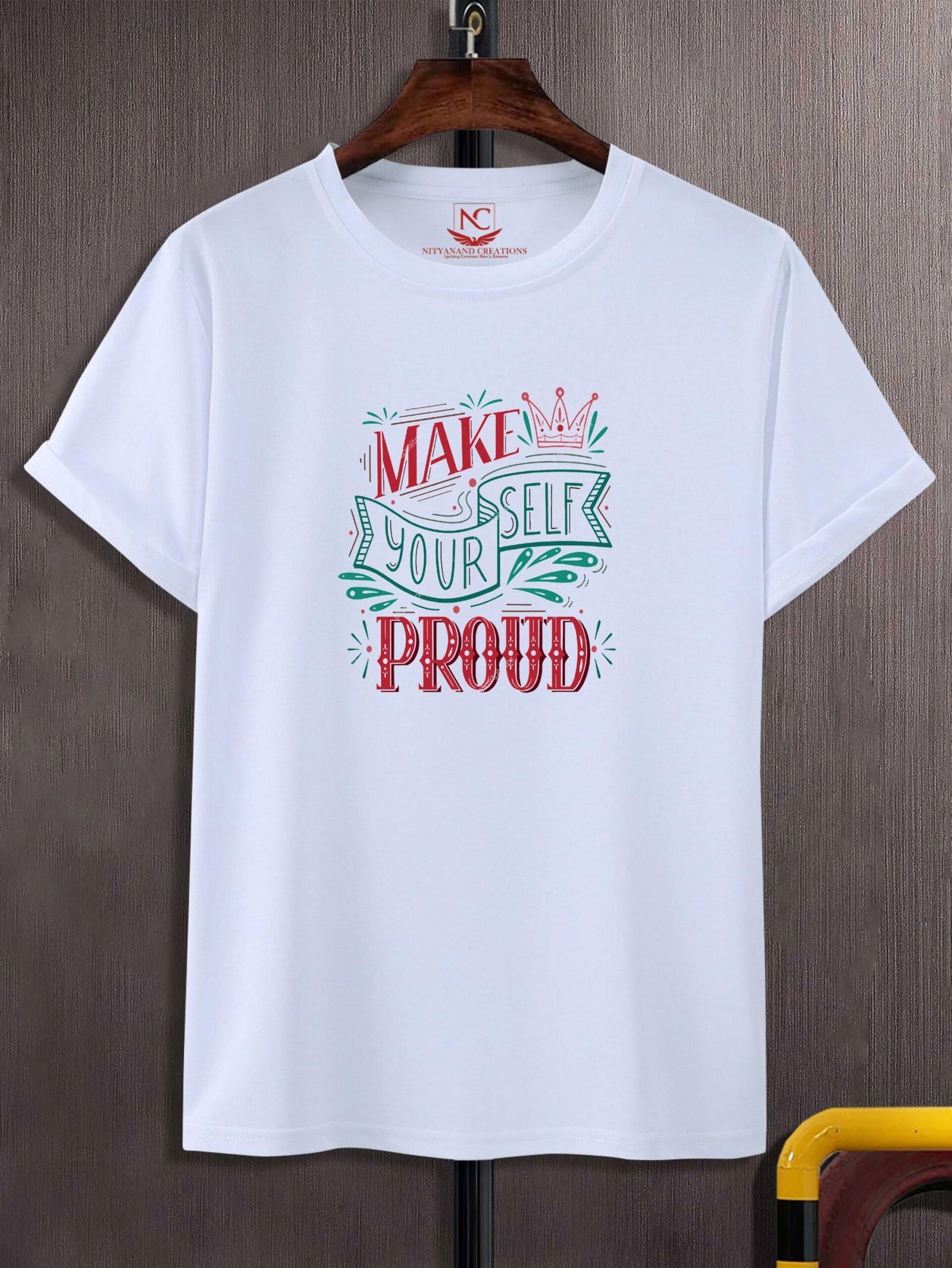 Embrace motivation and style with the Make Yourself Proud Graphic Printed White T-Shirt. Perfect for those who believe in the power of self-confidence and personal growth, this t-shirt combines a bold, inspiring message with all-day comfort. Whether you’re looking to add a motivational touch to your wardrobe or simply want a versatile piece to wear for casual outings, this polyester t-shirt is the perfect choice. Featuring the empowering “Make Yourself Proud” slogan, this shirt acts as a reminder to always strive for your best, while looking great at the same time.