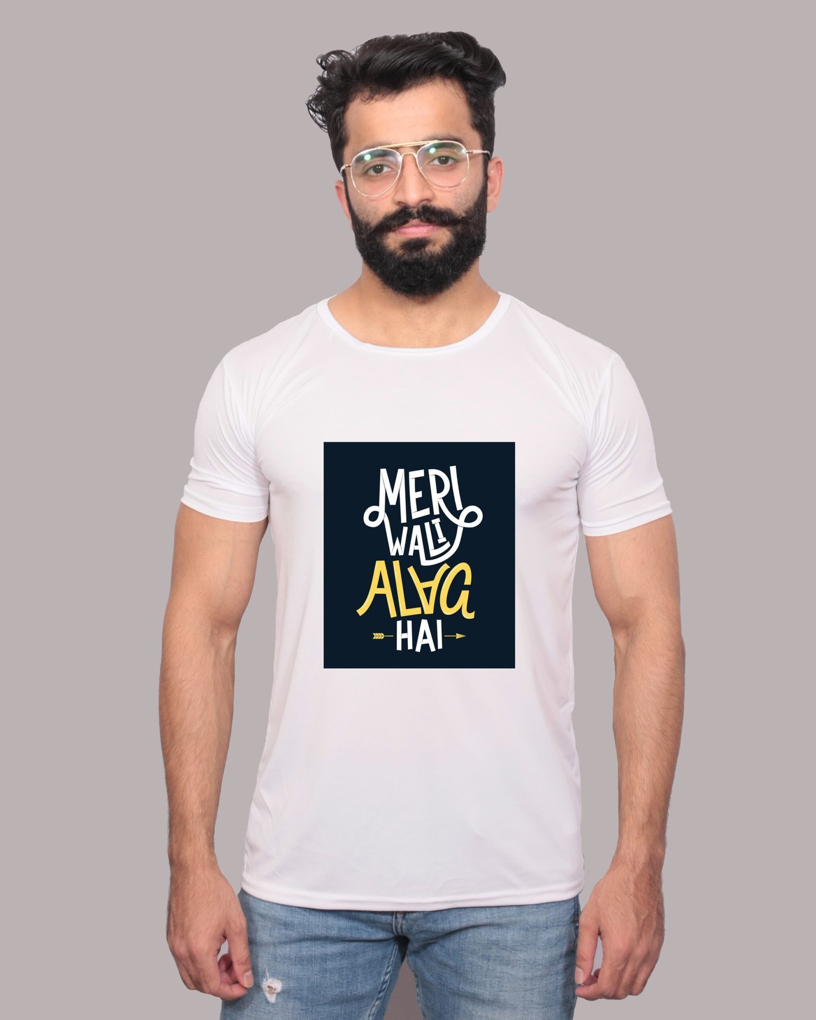 Introducing the Meri Wali Alag Hai graphic printed white t-shirt, a vibrant expression of individuality and style. This shirt goes beyond mere fashion; it’s a bold statement piece that celebrates uniqueness in a playful and trendy way. Perfect for those who love to stand out, this t-shirt is designed for anyone who appreciates a blend of humor and style in their wardrobe.