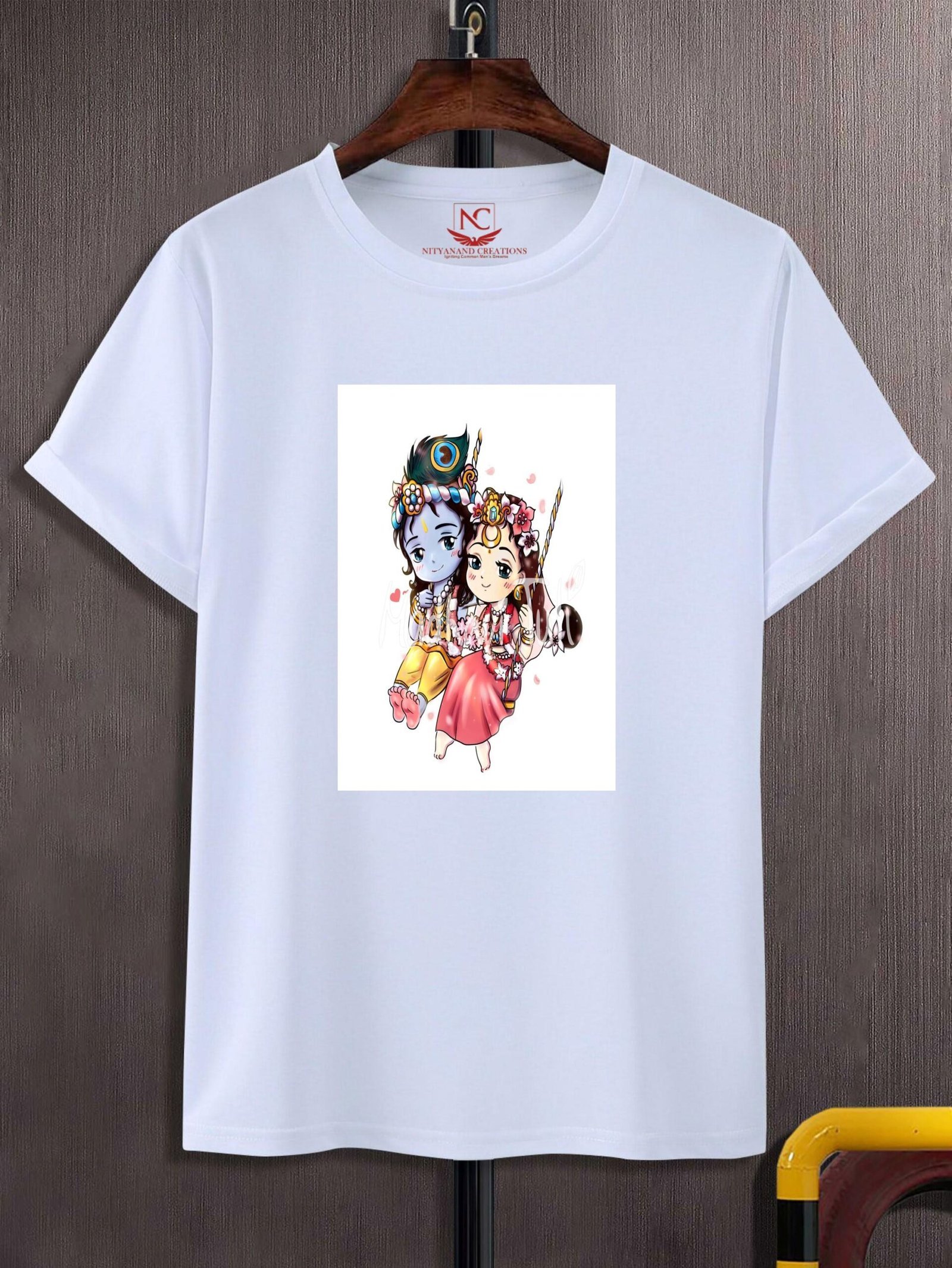 The vibrant colors in the design, including shades of blue, gold, and green, stand out against the crisp white background, making the t-shirt a visually striking piece. The rich detailing, from the peacock feather in Krishna’s hair to the elegant folds of Radha’s saree, showcases the artistry and beauty of the divine couple. This graphic not only serves as a symbol of love and devotion but also as a way to connect spiritually with the divine.