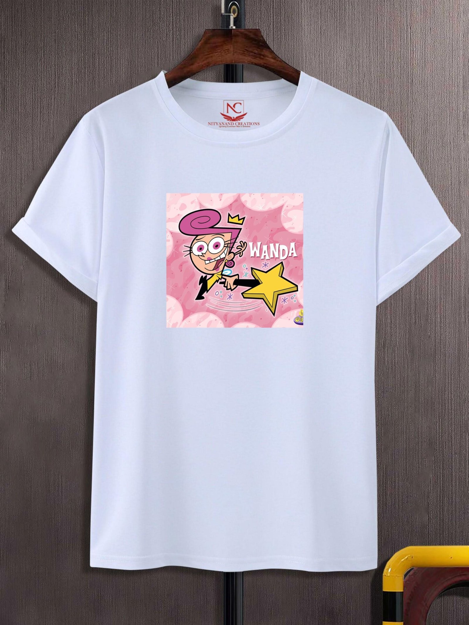 The design is printed with eco-friendly, high-quality inks that create a sharp, detailed image. The colors are bold and lively, standing out beautifully against the white fabric of the T-shirt. Whether you’re wearing it for a themed event or just to show off your love for The Fairly OddParents, the graphic adds a playful and nostalgic touch to your outfit. The detailed design captures Wanda’s magical charm and playful spirit, making it a perfect tribute to one of the show’s most beloved characters.